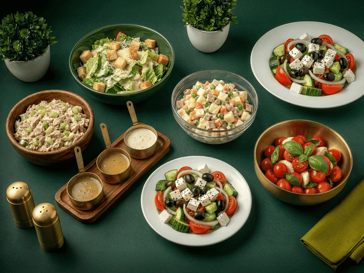 Classic Russian salad with fresh vegetables, creamy dressing, and a touch of herbs.
